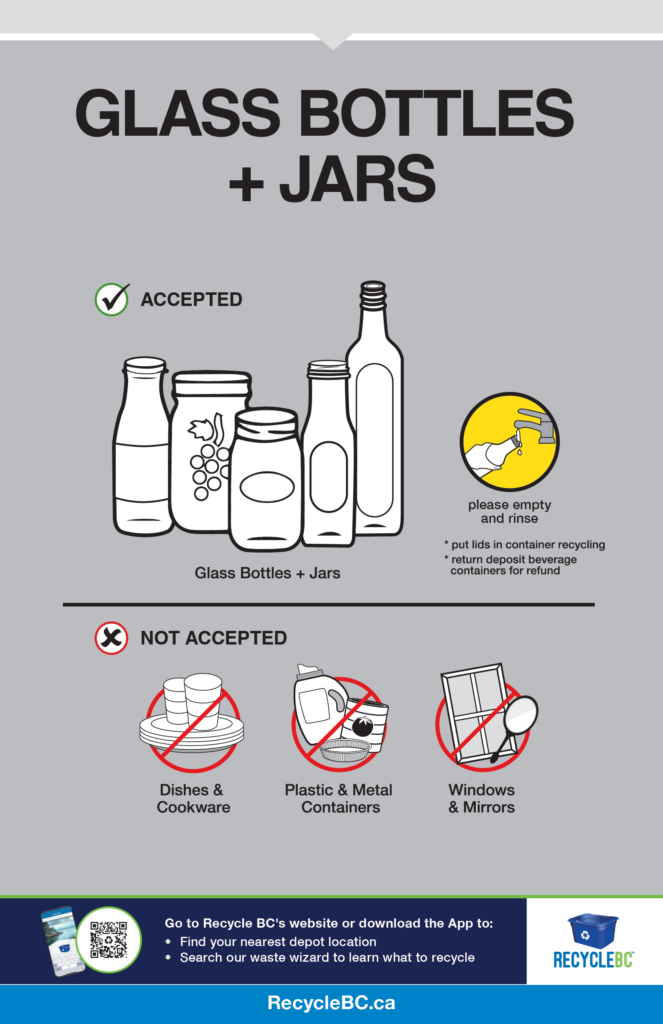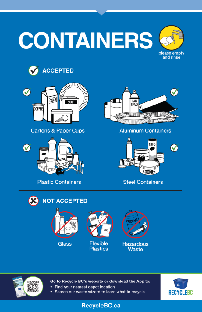 - Cartons and boxes with a deposit can be returned to depot in BC’s deposit program for a refund or included in container recycling
