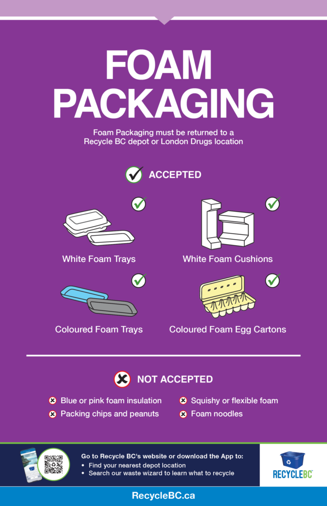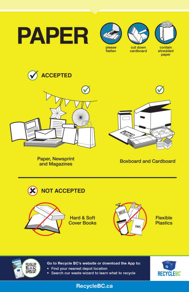 Most residential packaging and paper can be collected curbside or can be taken to depots for recycling. A few items are only accepted at depots. Search for material using Recycle BC’s Waste Wizard, or scroll down to view a summary of accepted materials and where to take them.